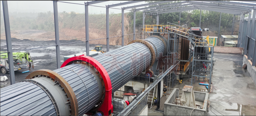 鄭州九天發往山西運城的煤泥烘干生產線,是一套高效協同的設備系統。當濕煤泥進入生產線,螺旋推進式進料口迅速啟動,變徑螺桿精準控制進料量,將煤泥均勻送入滾筒。此時,打散裝置同步運轉,高速旋轉的葉片將結塊煤泥破碎,為后續烘干奠定基礎。